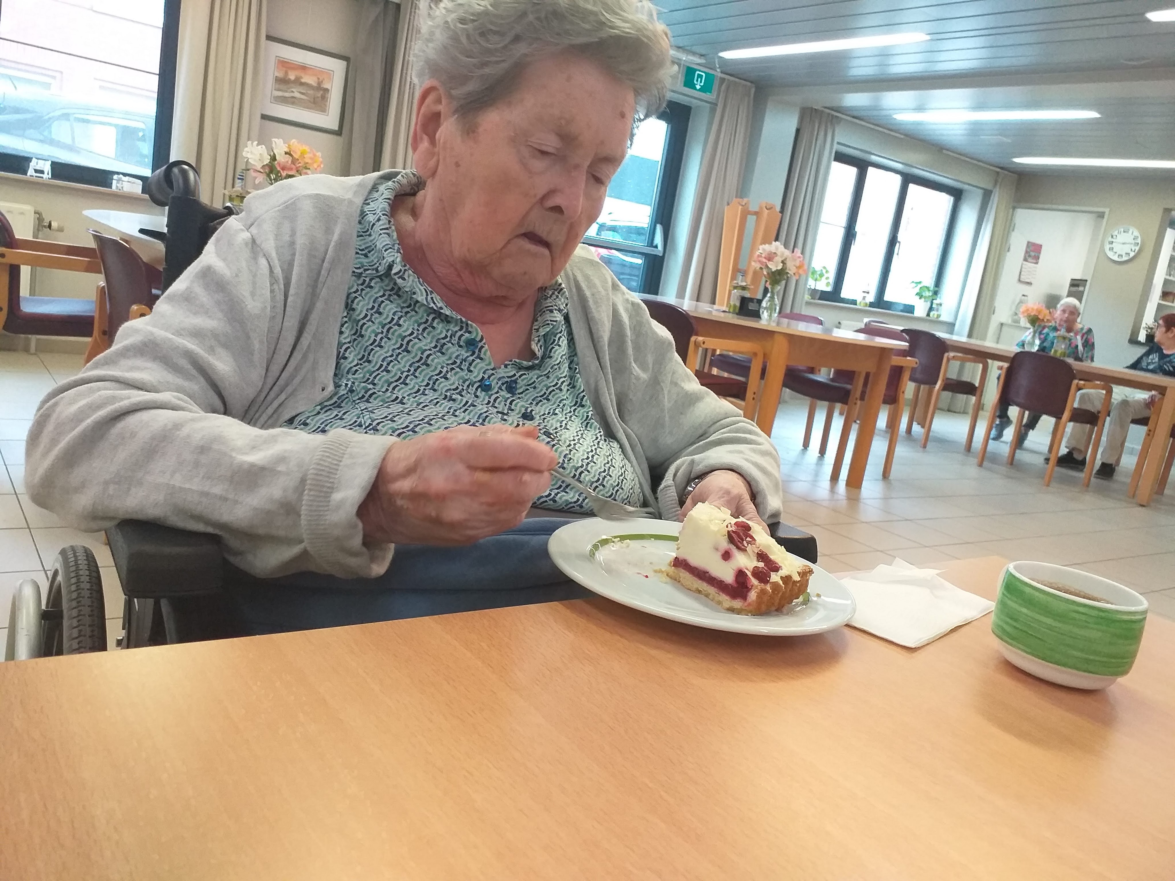 De foto heb ik genomen toen we samen een taartje gingen eten in de cafetaria van het rusthuis.