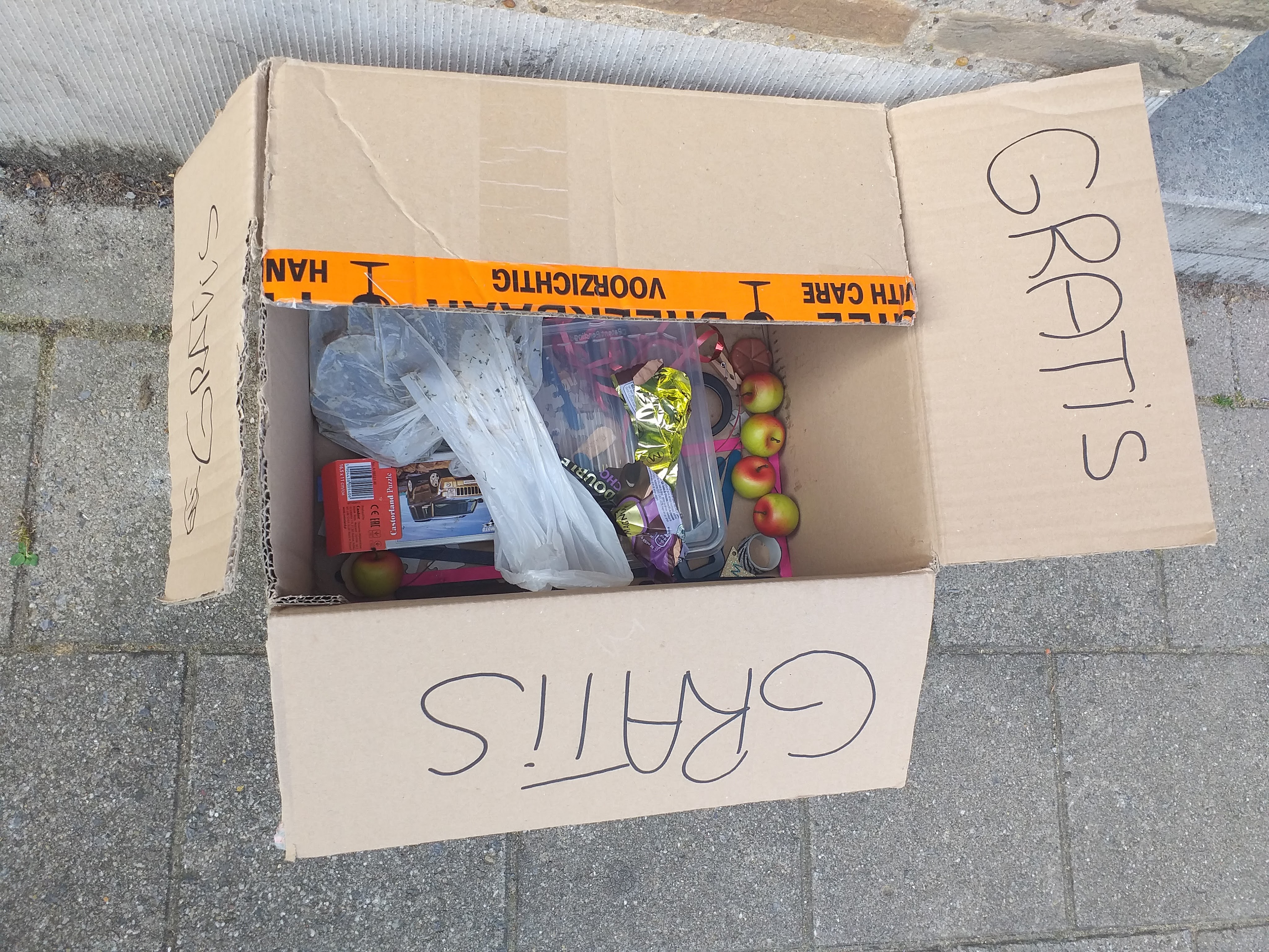 Zo’n doos met gratis spullen moeten de mensen in hun eigen tuin of pad zetten.. en er oog op houden dat er niks van troep bij gegooid wordt. Zomaar op straat zetten kan natuurlijk niet, dan werkt zoiets niet. Al is het idee wel sympathiek.