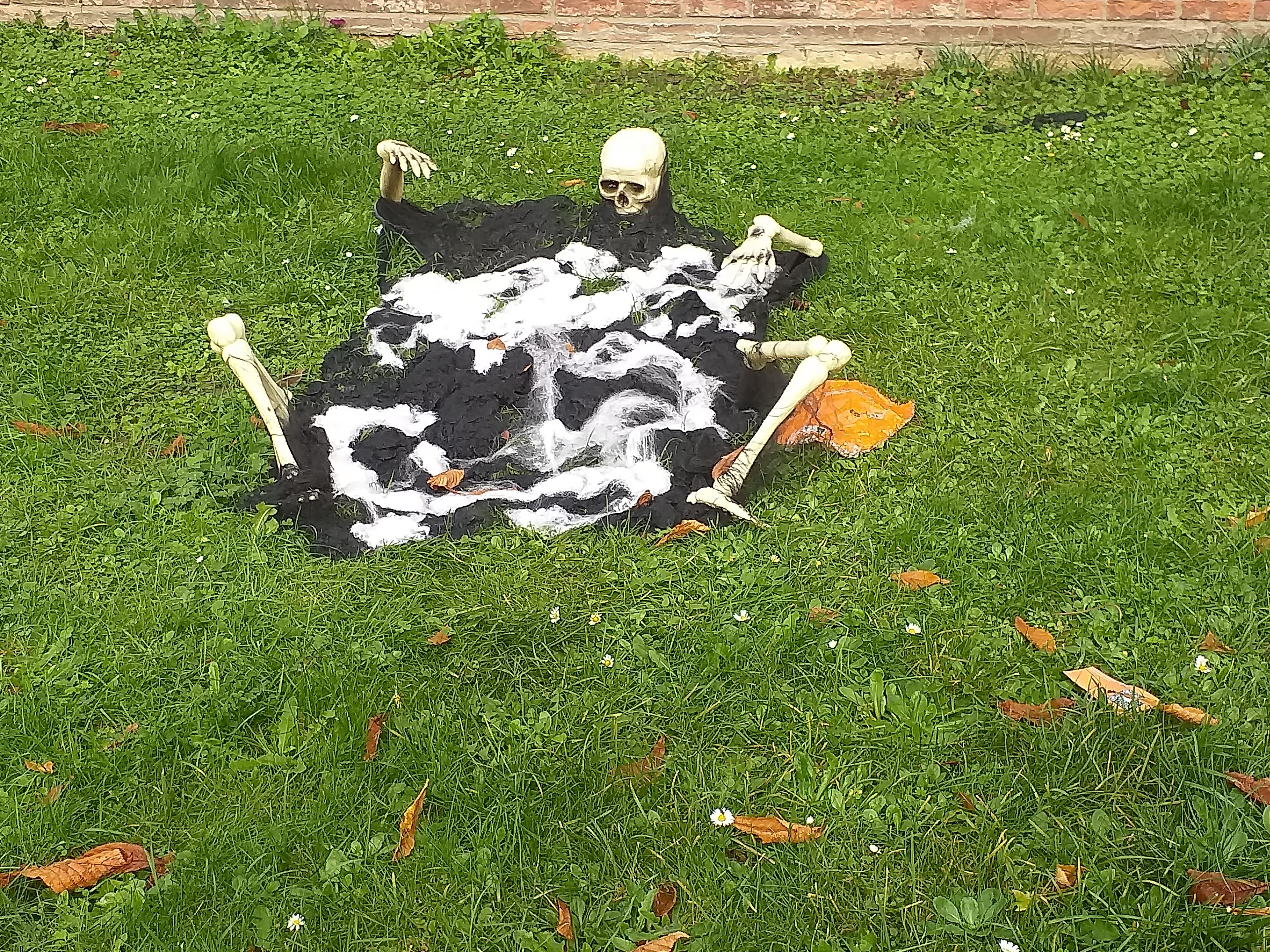 Wel knap gedaan van die mensen, zo’n originele Halloween decoratie zag ik nog nergens in een voortuin.