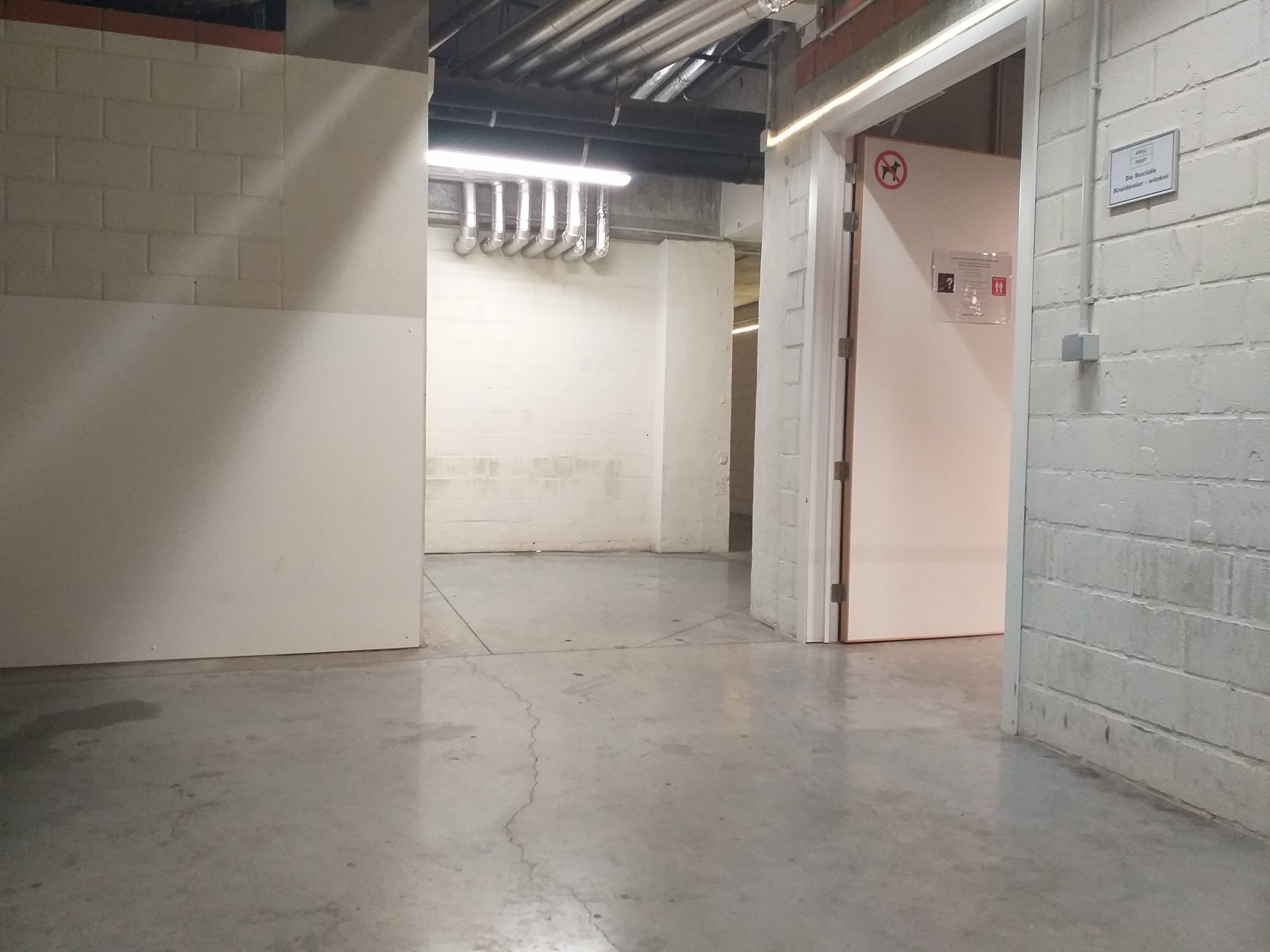 Wat je op de foto ziet is de verbindingsgang van de ondergrondse parkeergarage naar de trap/lift die je naar Oppost brengt. In Oppost bevindt zich onder andere de kringwinkel. Om de veertien dagen op donderdagvoormiddag is Eva er present voor “Bolleke wol” ofte de breiclub van Oppost.