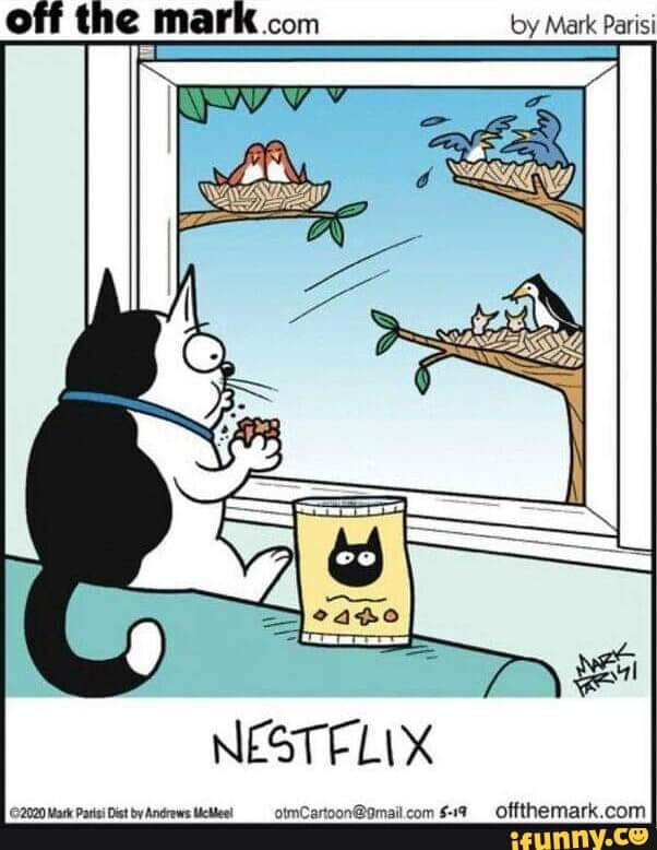 Geweldige cartoon! Moet heerlijk zijn voor die kat, dit uitzicht tijdens het snoepen. Goed w-end.