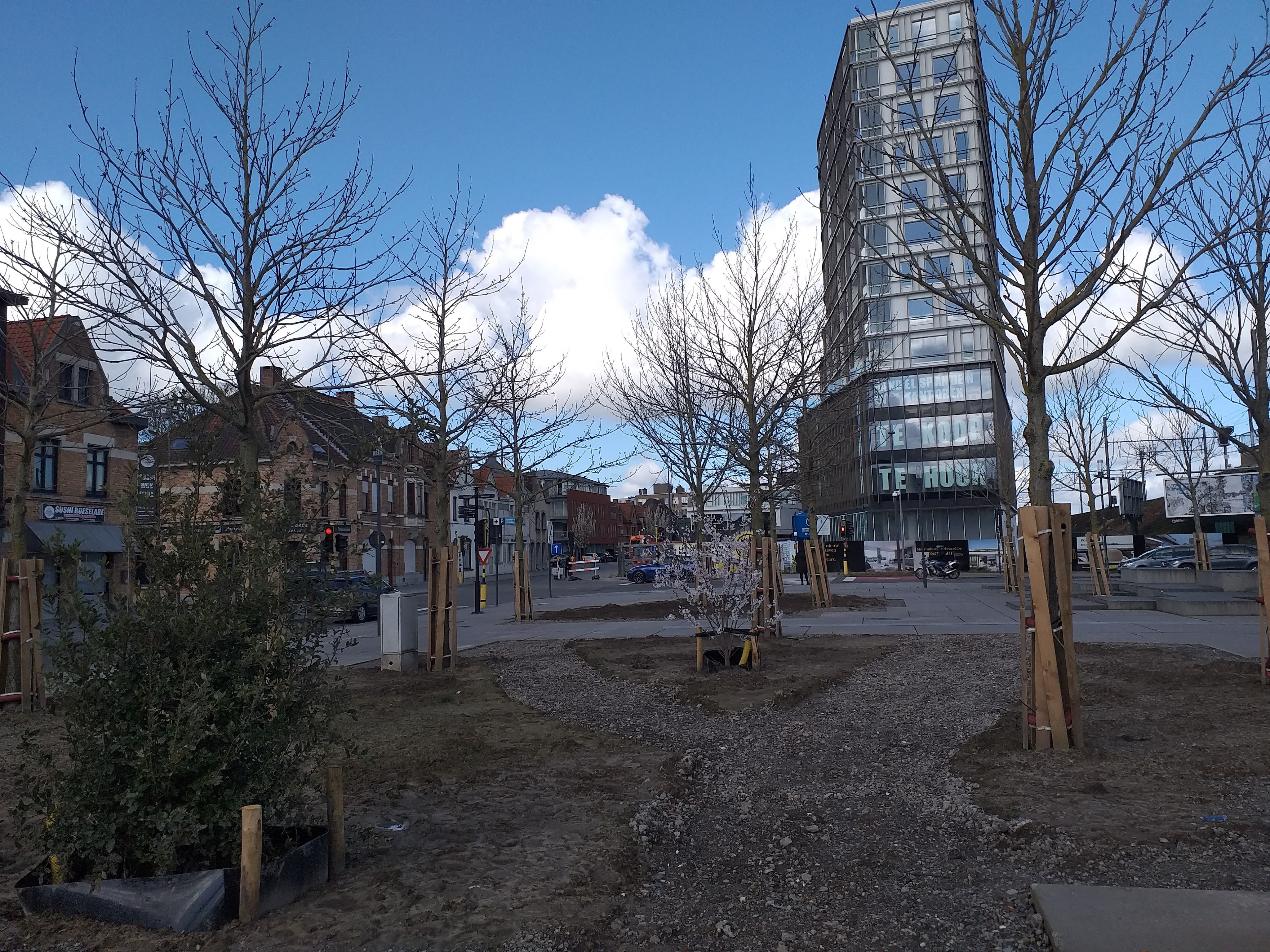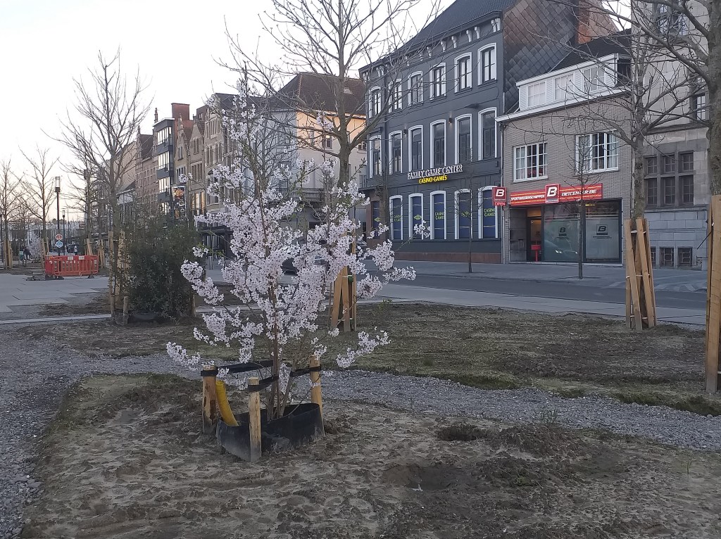 Op het stationsplein zijn ze druk bezig met de ontharding ofte de vergroening. Onlangs werden reeds struiken en bomen geplant. Ik blijf de werken volgen.