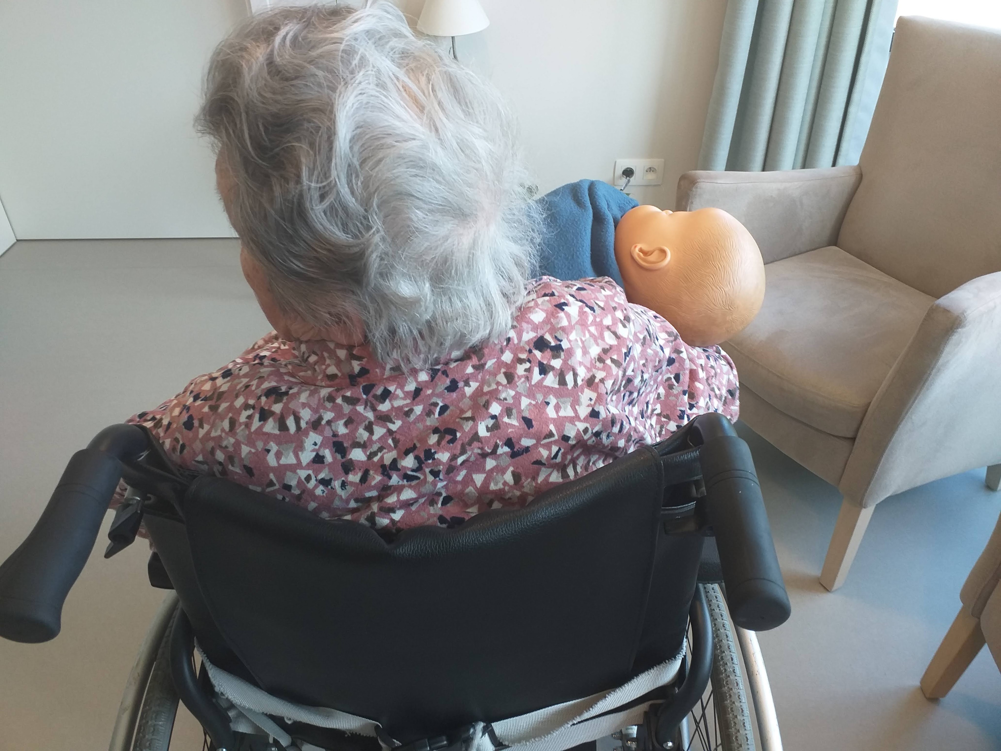 Zondag waren Eva en ik weer eens te vinden in het woonzorgcenter waar mijn moeder verblijft. Ze was zoals steeds blij ons te zien. Zoals steeds zat ze vast in haar rolstoel. Nu had ze een pop bij zich. “Ik zorg voor dit kindje”liet ze ons weten. Nu en dan praatte ze tegen dat “kindje”. Een verpleegster liet ons weten dat moeder rustig geworden is sedert ze voor die pop mag zorgen.
