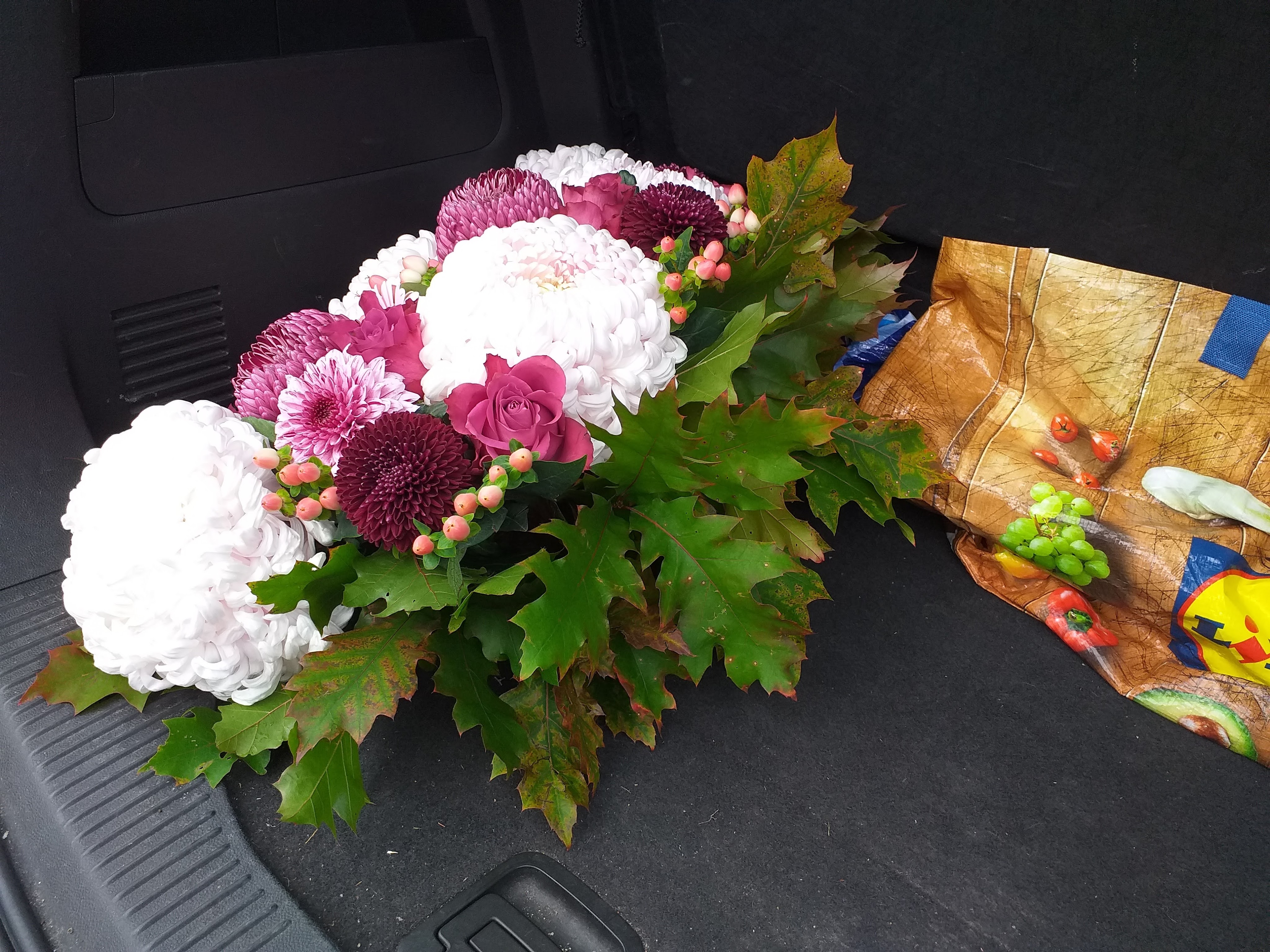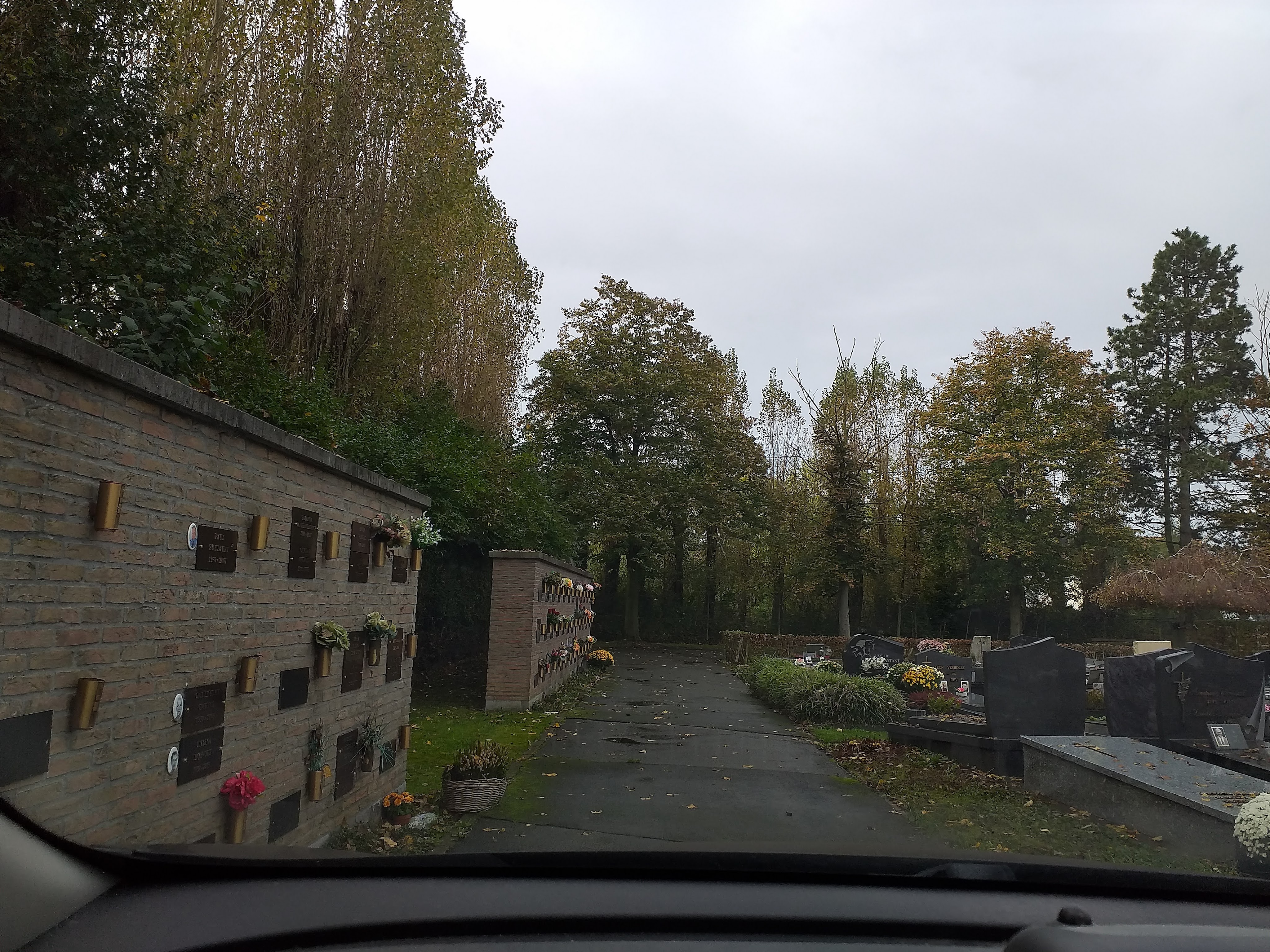 Nadat we de bloemstukken opgehaald hadden reden we naar de begraafplaats. Terwijl ik in de auto wachtte plaatste buurman de bloemen bij de graven. Wel een vreemd gevoel om zo langs die graven en muren te rijden. Gelukkig weten de doden van niets. Die zullen dan wel niet geschrokken zijn toen ik voorbij reed.