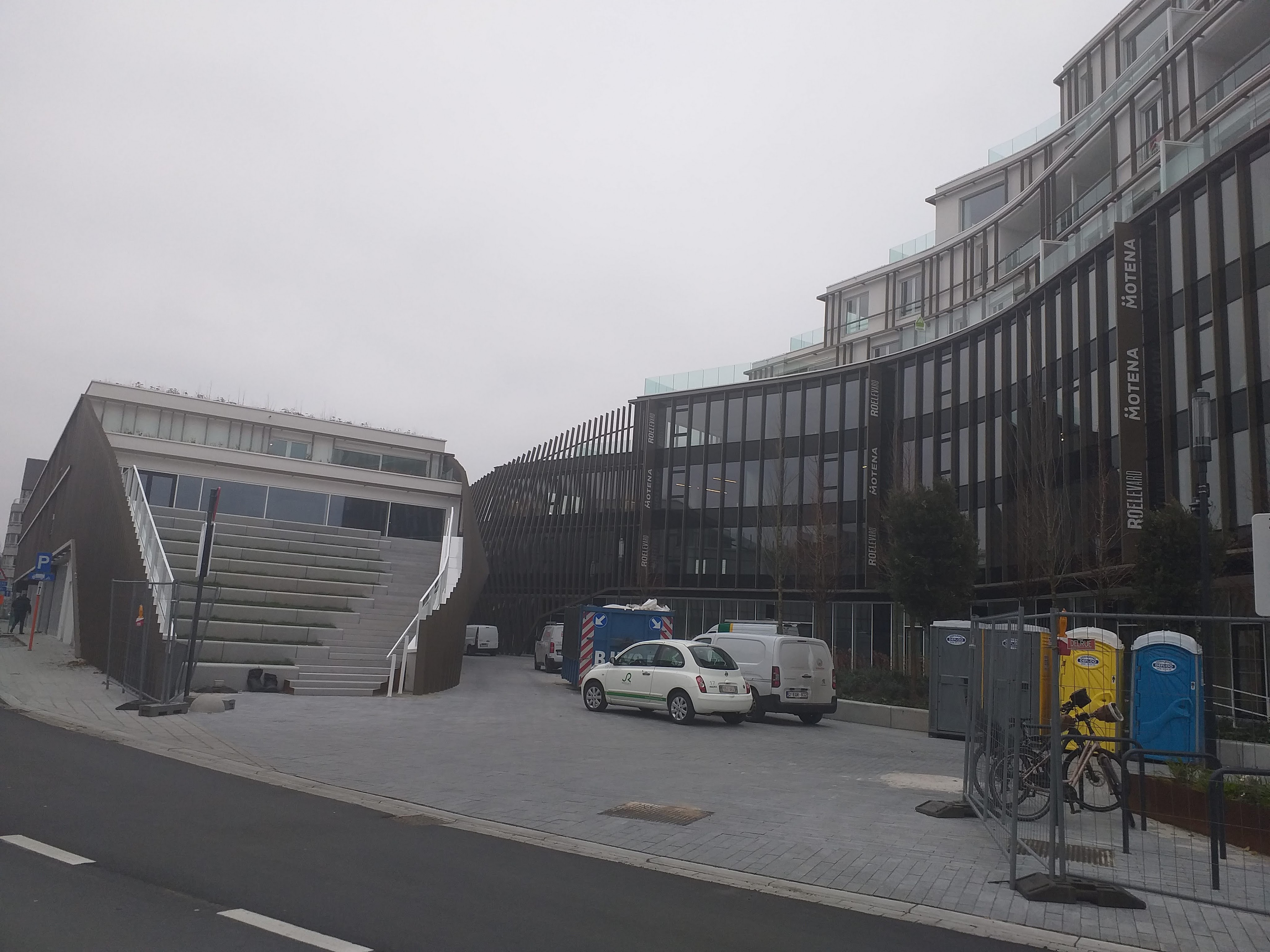 Buiten is men nog druk bezig met van alles in orde te brengen. Op het gelijkvloers is er reeds een bankfiliaal en blijkbaar gaat Motena ook een deel van de ruimte innemen.
