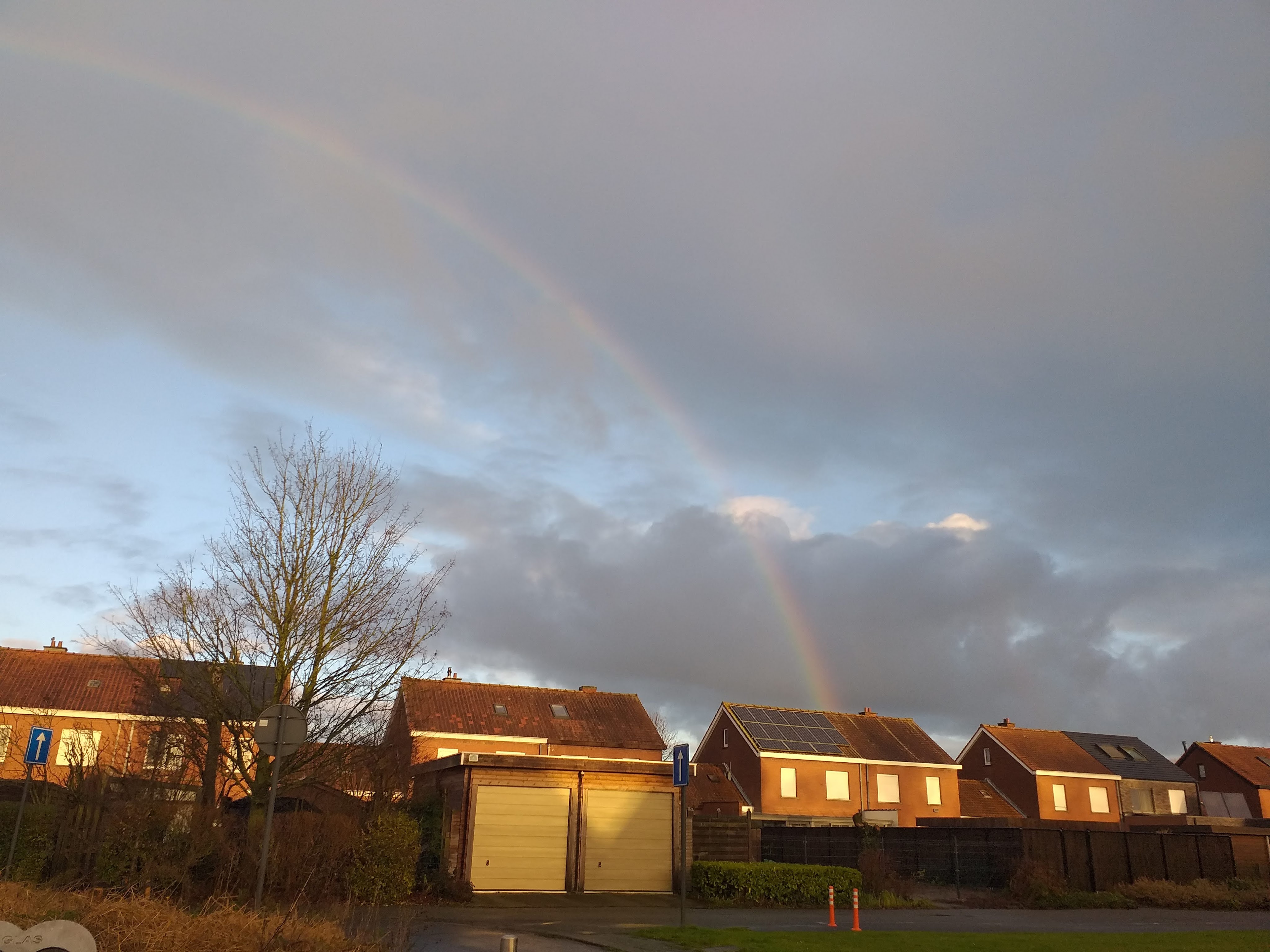 Ik was gisteren in de voormiddag bij de glasbol niet ver van het speelpleintje waar ik zwerfvuil opruim. Toen zag ik plots deze regenboog. Gelukkig had ik mijn telefoon bij me om dit op de foto te zetten.