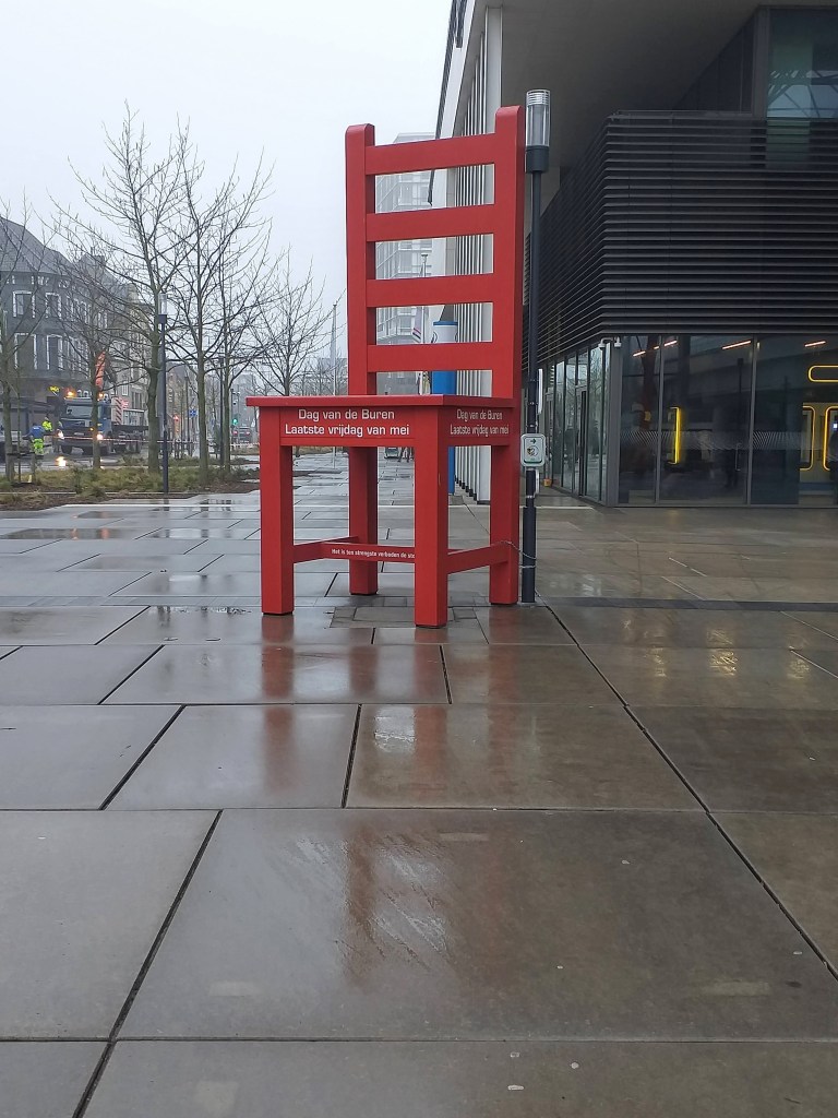 Die stoel krijgt vast veel aandacht. Hopelijk zit-ie goed in de verf want er zullen tussen nu en eind mei nog veel buien vallen. Wij trekken gewoon een jas aan.