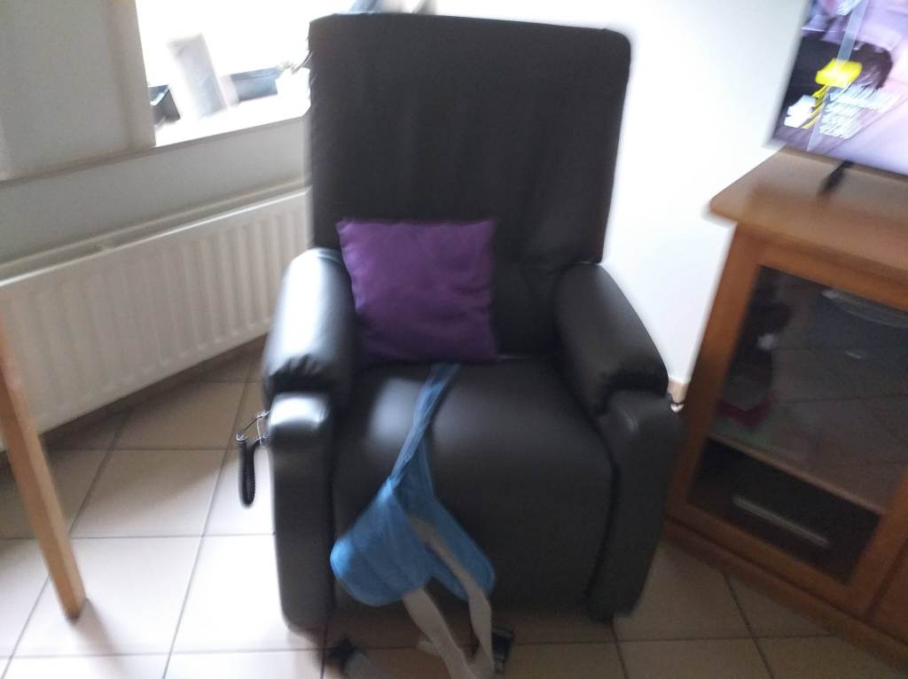 Mijn moeder gebruikte tot voor kort een zetel die daar reeds stond. Waarschijnlijk van een vorige verblijver. Die was stuk. Ze kon haar benen niet meer leggen zoals voorheen. Dan maar naar de thuiszorgwinkel voor een nieuwe. Ik kon daar uit verschillende grootte en types kiezen.
