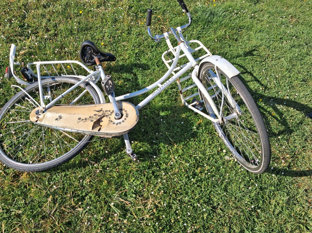 Ergens mist een meisje haar mooie witte fiets. En daar ligt hij dan, doodgetrapt in een veldje. Ik zou het eerder een ontvoerde en vermoorde fiets noemen.