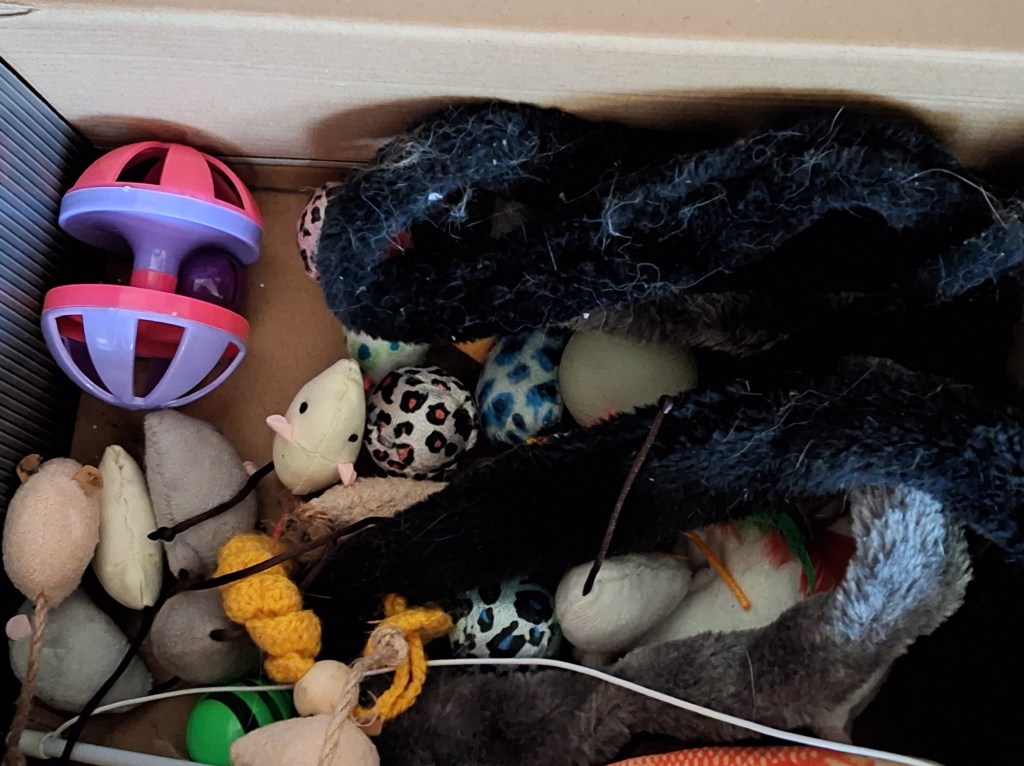 In onze woonkamer staat een doos met speelgoed. Speeltjes voor Felix onze zwarte kater. Nu en dan snuffelt hij in die doos en haalt dan een speeltje uit de doos. Daar speelt hij dan mee.