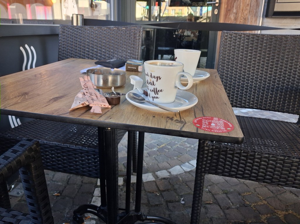 Gisteren had hij een afspraak op het stadhuis. Of ik hem wou brengen en bij hem blijven voor het geval hij een en ander niet begrijpt. Mij OK. Vooraleer het stadhuis binnen te stappen genoten we op een terras tussen de kermisattracties van enkele koppen koffie.