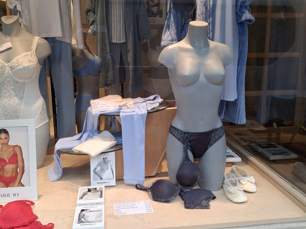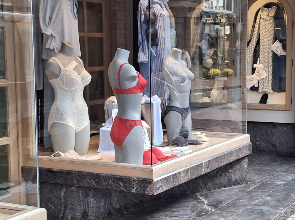 Aan de overkant van de straat zag ik deze “dames”. Die hebben duidlijk het hoofd voerloren. Verder vertonen ze zich schaamteloos in zwoele lingerie. Dit in deze kille donkere dagen. Er is er zelfs eentje die ongegeneerd haar borsten toont aan de voorbijgangers. Je moet maar durven.