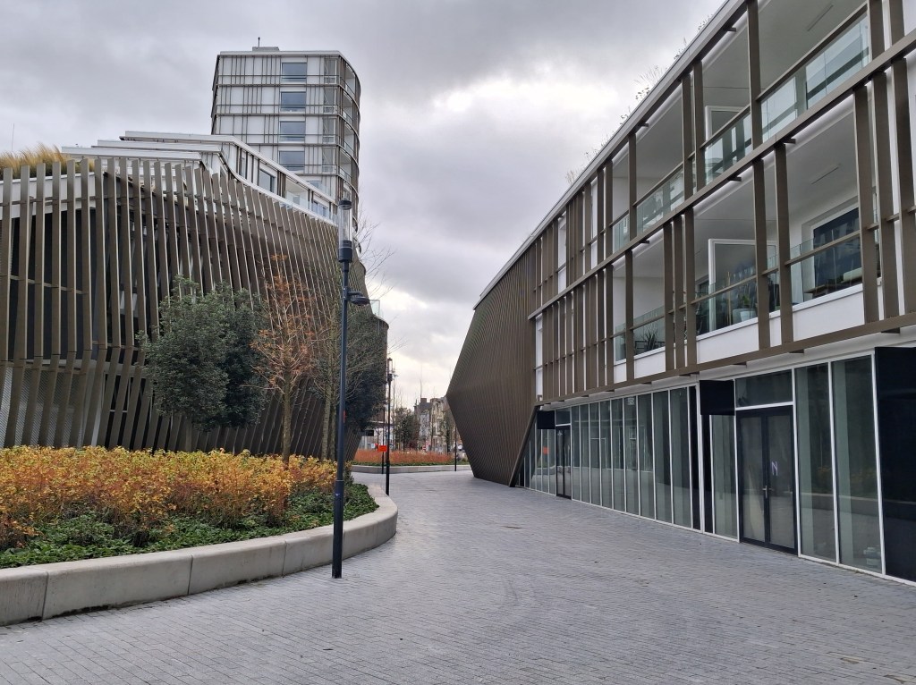 Onlangs verdwenen de laatste hekkens zodat ik er van uit ga dat het grote werk volledig af is. Dat was voor mij een reden om daar eens rond te fietsen. Er is al een bank gehuisvestigd en ook Motena is er in getrokken. Hier en daar zie ik dat er appartementen bewoond zijn. Dus ik vermoed dat tegen de lente er veel leven zal te bespeuren zijn. Nu is het er nog doods.