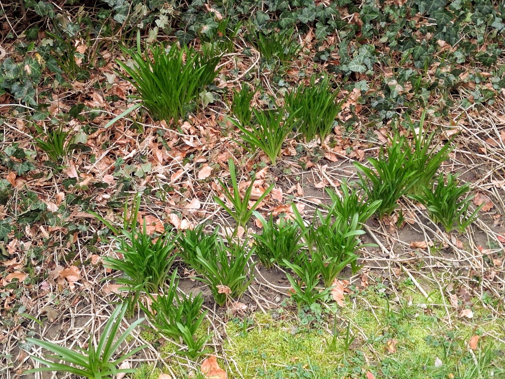 Toen ik maandagmorgen door de tuin stapte zag ik hier en daar groen de kop opsteken. Wat wil je met dat lenteweer van de afgelopen dagen.